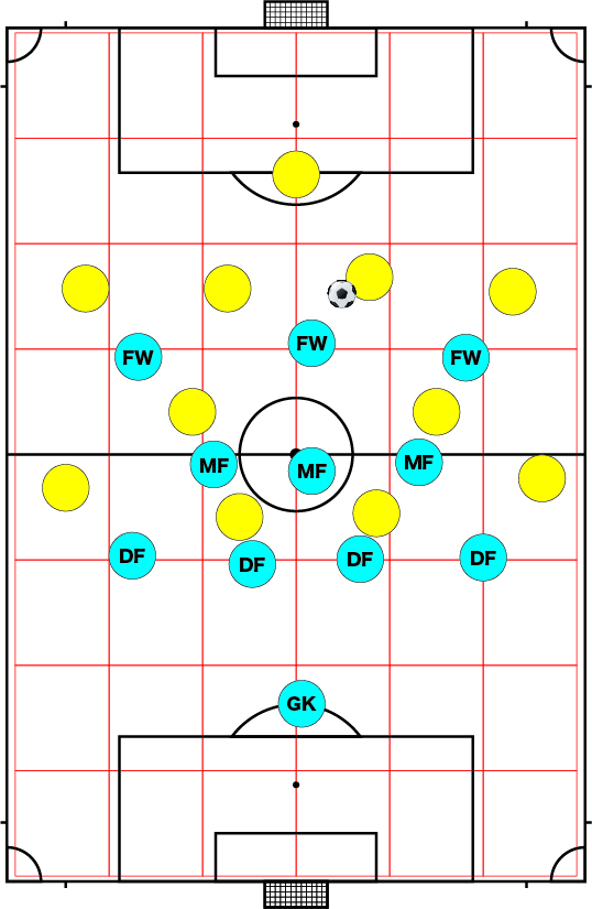 MFを中心にしてショートパスでリズムをつくりながらボールを回すことを意識する。ただボールを動かせばいい訳ではなく、テンポよくボールを動かしながら、相手選手を動かしてイレギュラー(マークミスなど)を生じさせる事を意識する。