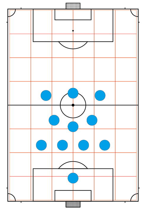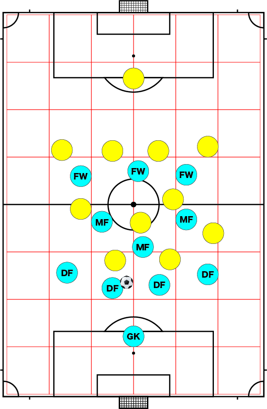 バイタルエリア意外は、図の中にある⬜︎枠内に一人の選手がポジションをとれば、大体10m程度の距離感を意識する事ができる。少ないタッチ数でショートパスを増やしながら、パスは斜めの意識を持って、付ける・サポートする際にも角度を意識してテンポ良くボールを動かしリズムをつかむ。